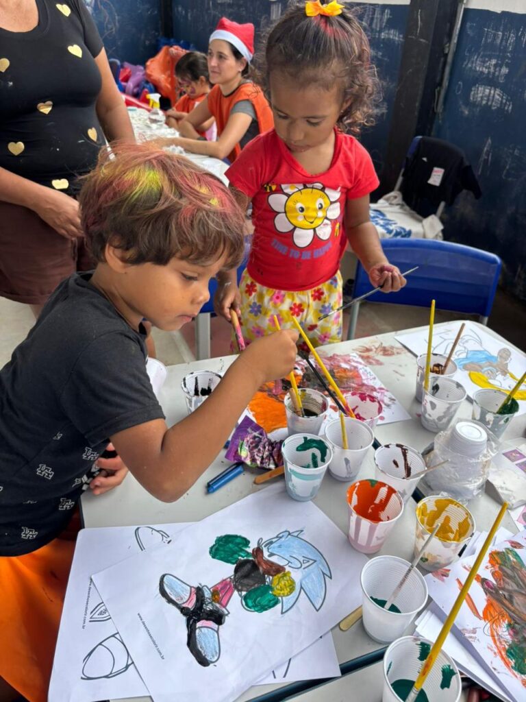 No sábado da festa, a equipe chegou cedo para organizar o ginásio, preparar os espaços das atividades, os lanches e os refrigerantes. Antes da abertura dos portões, que aconteceu às 10h30, nos reunimos em oração, entregando o dia nas mãos de Deus. Às 14h, teve início a entrega das sacolinhas de Natal, um dos momentos mais aguardados pelas crianças e famílias.