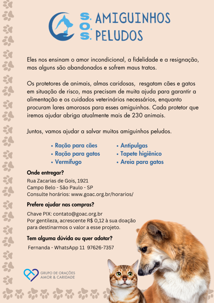 Dia 20/12/25 nosso projeto Amiguinhos Peludos entregou ração para cãezinhos e gatinhos resgatados. Foi um dia emocionante, que misturou sentimentos de coração apertado com alegria e gratidão por terem sido acolhidos por Olga, Neide, Cristina e Anderson, os quatro protetores atendidos pelo GOAC, através da nossa querida Fernanda. São mais de 420 cães e gatos, entre adultos e filhotes, todos aguardando adoção. O resgate é constante, por isso, devemos lutar pelo fim da cultura do abandono e incentivarmos a castração.