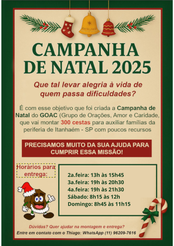 Neste fim de ano, convidamos você a fazer parte de uma corrente do bem que pode mudar o Natal de muitas pessoas. Começamos a arrecadação de alimentos não perecíveis para montar 300 cestas básicas natalinas destinadas a famílias em situação de vulnerabilidade na comunidade da Vila Tanise, em Itanhaém, atendidas pelo Obreiros da Luz Divina. A lista dos alimentos está na seção Solidariedade desta edição.